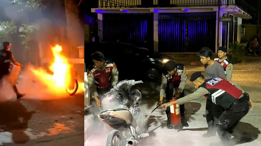 Tanpa menunggu tim pemadam kebakaran tiba, personel Unit Patroli Sat Samapta langsung bergerak cepat menggunakan alat pemadam api ringan (APAR) yang tersedia di SPBU untuk mengendalikan kobaran api agar tidak menyebar ke area sekitar.