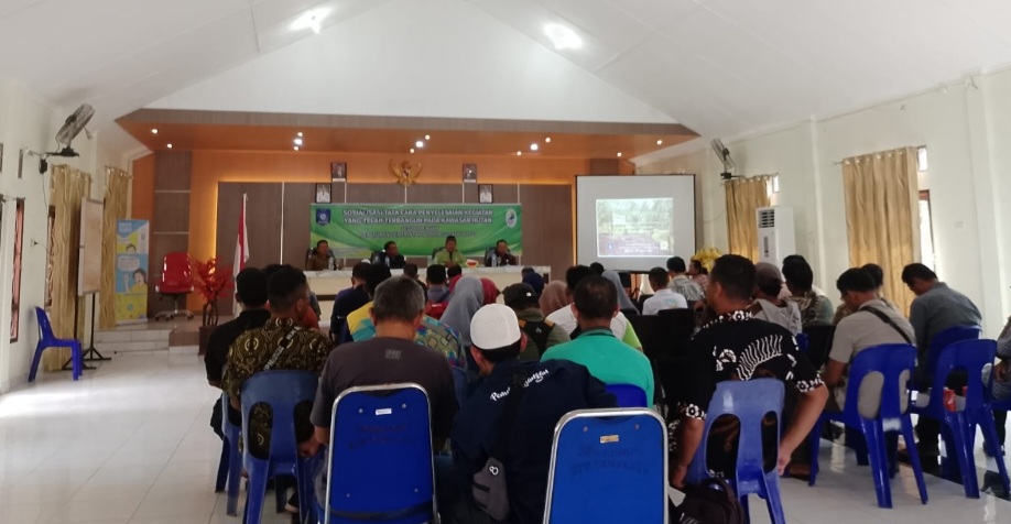 Tampak dalam kegiatan sosialisasi ini, selain mendengarkan pemaparan dari narasumber, para peserta Sosialisasi Tata Cara Penyelesaian Kegiatan Yang Telah Terbangun Pada Kawasan Hutan ini diberikan kesempatan melakukan pertanyaan dengan narasumber dalam sesi dialog tanya jawab.