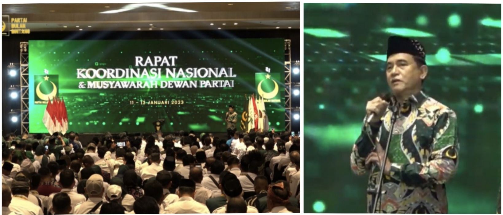 “Bismillahirrahmanirrahim, pada sore hari ini secara resmi saya buka Rapat Koordinasi Nasional dan Musyawarah Dewan Partai Partai Bulan Bintang Tahun 2023,” ujar Presiden Jokowi.