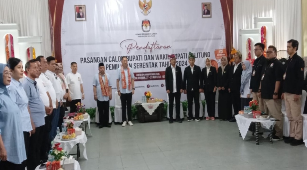 Pasangan IM ‘Isyak-Masdar’ didampingi koalisi partai yaitu PSI, Gerindra dan Demokrat serta para relawan mendaftar ke KPU Kapupaten Belitung pada Kamis (29/8/2024).